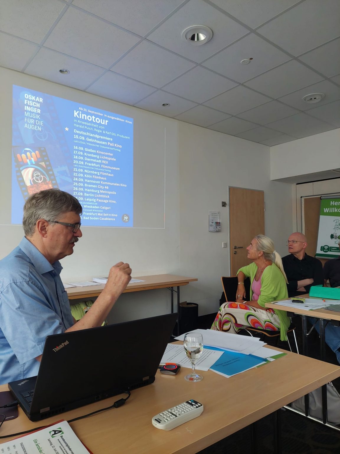 Die Versammlung begann mit einem sehr interessanten Vortrag von Harald Pulch (stellv. Vorsitzender LV Rheinland-Pfalz). Vor seinem Schlaganfall im Mai 2009 war er Professor für Filmgestaltung an der Hochschule Mainz. Der Filmpionier Oskar Fischinger hatte ihn schon immer interessiert. So hatte er vor seiner Professur schon angefangen, Elfriede Fischinger zur Arbeit ihres Mannes zu interviewen. Nach 30 Jahren ist der Film „Oskar Fischinger – Musik für die Augen“ fertiggeworden. Die Kinopremiere konnte im September 2023 in Gelnhausen gefeiert werden.
